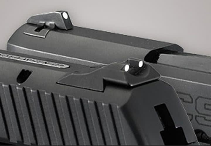 Close-ups of the LC9's three-dot sight system.