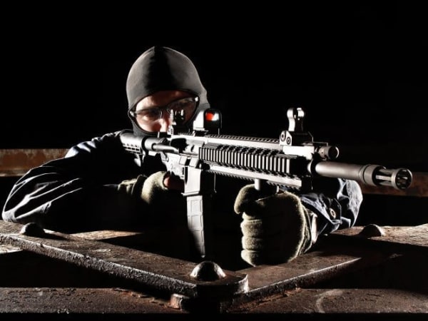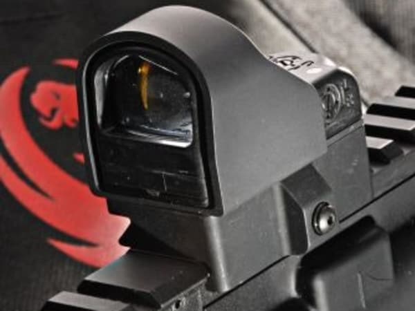 Ruger's SR-556 was tested with Insight Technologies' new Mini Red Dot Sight (MRDS), a lightweight ruggedized reflex sight that mounts to any MIL-STD 1913 rail. Available with both 3.5 MOA (pictured) or 7.0 MOA dot sizes, the sights also possess MOA positive click windage and elevation adjustments. Weighing just 0.85 ounces, the lightweight sight makes it a natural for tactical use. Its top loading battery compartment ensures no change of windage during a battery change. The MRDS uses a single 1632 battery that Insight claims will last up to a year in the automode.