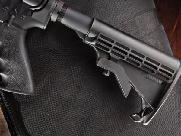Machined from an aluminum forging, the lower receiver is outfitted with a six-position M4-style collapsing stock and a rubber Hogue pistol grip.