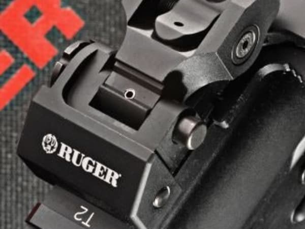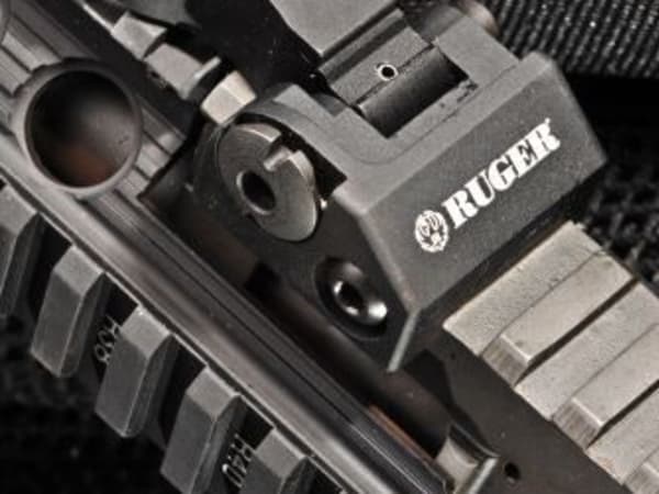 Ruger's SR-556 offers the option of an optic or flip-up iron sights. The rifle's front sight is pictured.
