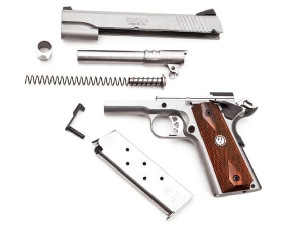 Disassembly shows the Browning-style recoil system used in Ruger's SR1911 pistol.