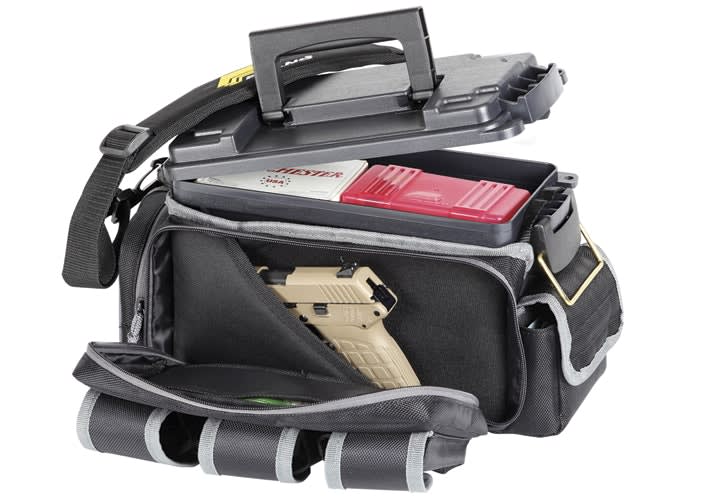 The smallest in the X2 family, Plano's 1312 X2 Range Bag is designed to be the perfect range companion for the concealed carry handgun enthusiast, carrying a medium frame pistol inside the large front zippered pocket. The bag’s creative back pocket provides additional storage and folds out to serve as a padded gun mat on the bench. Large multi-purpose pockets flank each end of the 1312 X2 Range bag—one fully zippered and the other with a Velcro flap—providing ample storage for shooting accessories, tools, or personal protective gear. The outside of the large front pistol pocket is adorned with three specialized magazine pockets.