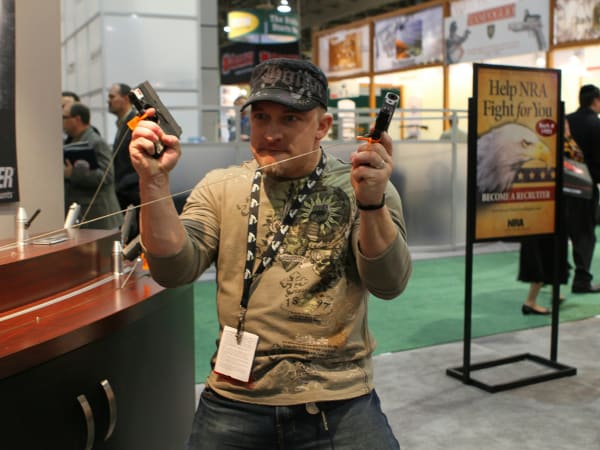 One attendee displays his best "Yosemite Sam" pose on the show floor.