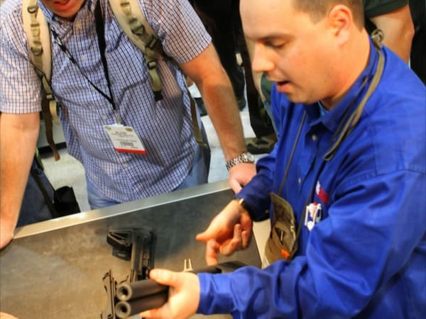A Kel-Tec rep dissassembles the KSG, 14-round dual-magazine shotgun.