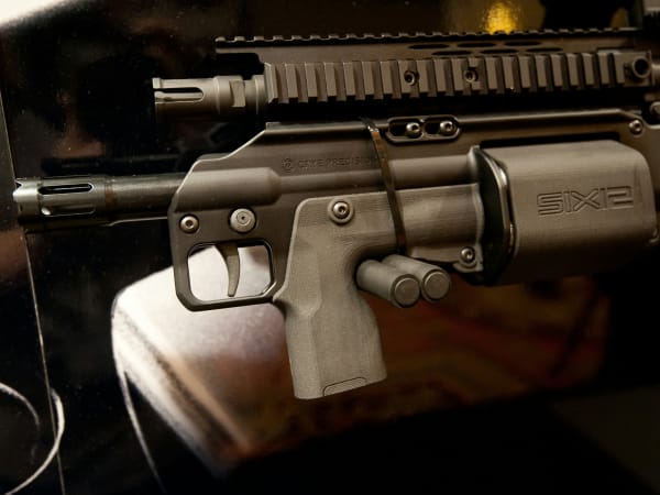 Crye Precision had its new Six12 bullpup-revolving shotgun on display at the 2014 SHOT Show. The weapon can be mounted on an AR handguard/rail or on it’s own chassis. This is Crye’s first venture into the gun world and is clearly made for the breaching needs of tactical teams. The Crye Precision Six12 will come in 3 models made
