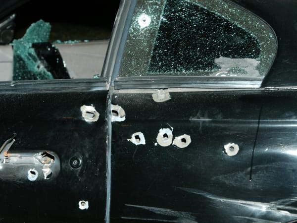 Sgt. Fleming fired his Glock 21 chambered in .45 ACP that ripped nearly 1-inch-wide holes in the Mustang.