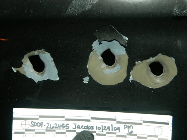 The investigation showed the various trajectories of bullets that penetrated Brooks' Ford Mustang.