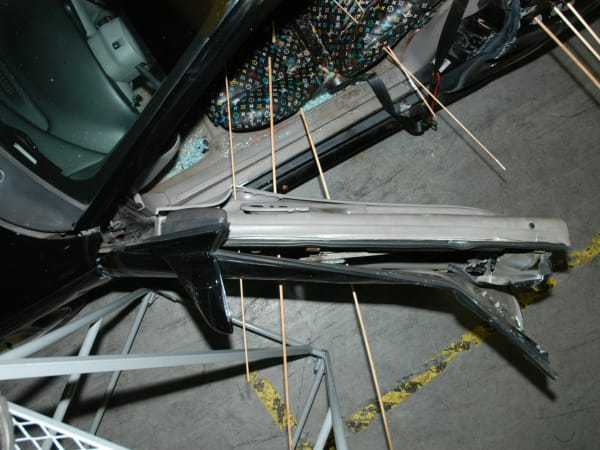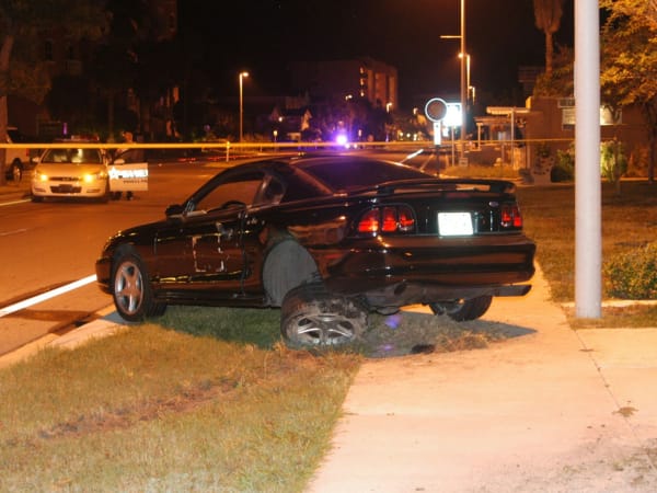 After deputies performed the PIT maneuver, Brooks' Mustang spinned and jumped a curb. The impact nearly tore away his left, rear wheel.