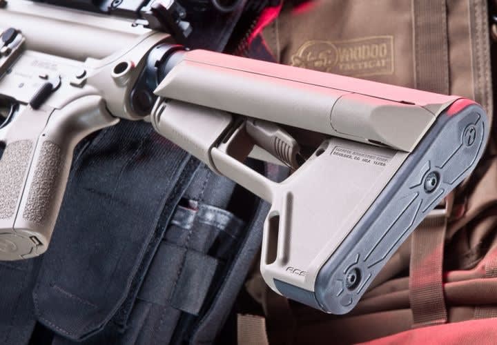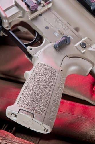 A Magpul pistol grip improves ergonomics.