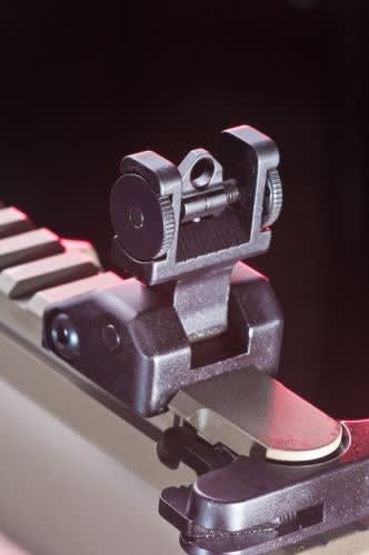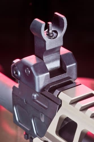 The carbine includes a flip-up rear back-up iron sight.