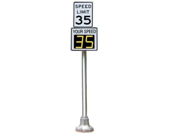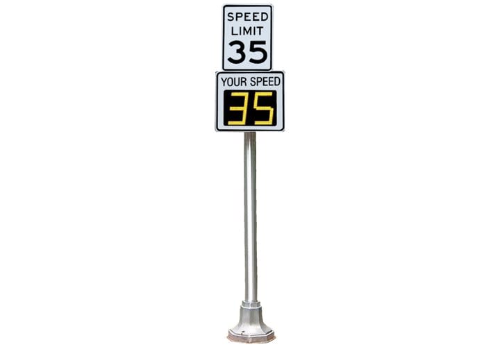 The RadarSign Titan TC-400B is a battery powered radar speed sign that's lightweight and durable. The sign weighs 20 pounds. The faceplate measures 24-by-21 inches with 3-inch lettering. It can mount in minutes to poles with a small, universal mounting bracket. The internal .25-inch Bashplate protects components from abuse or vandalism. The 11-inch amber LEDs with directional beam technology provide a quality viewable display with minimum energy usage. It has a runtime of two weeks and field replacement of batteries allows for multi-month usage. It is equipped with Bluetooth for wireless operation and the data can be processed directly to an off