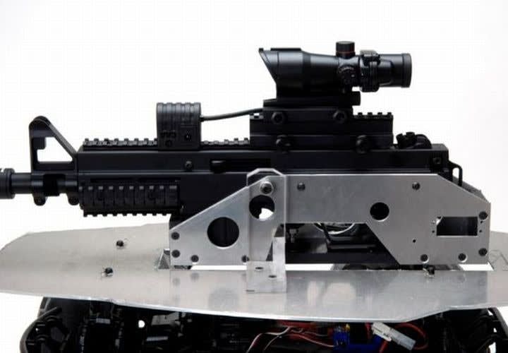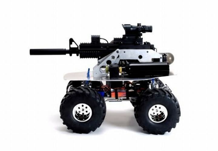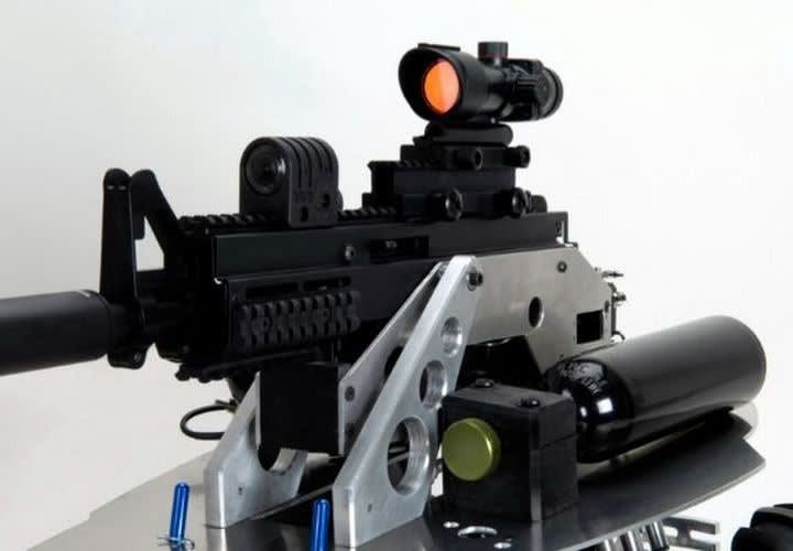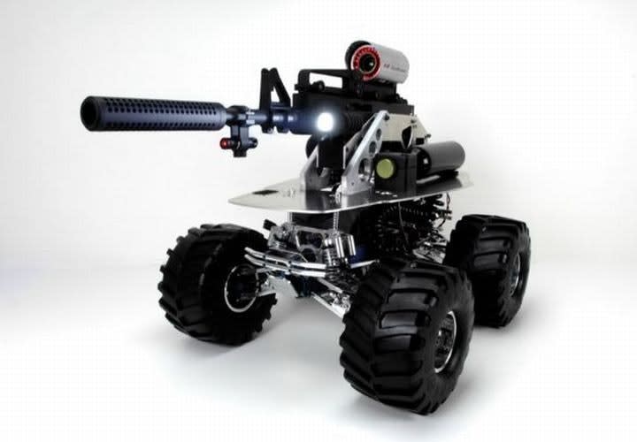 The SWAT BOT Robotic Weapon is a first-person view, unmanned ground vehicle that allows a remote operator to record video in a hazardous environment. It can be acquired fully equipped for $9,900.