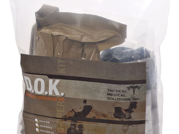 Tactical Medical Solutions' compact Downed Operator Kit (DOK) contains the items essential for treatment of serious injuries encountered by law enforcement and is compact enough to fit in a cargo pocket or glove box. It can also mount to a roll bar or protective shield in a patrol car or tactical vehicle. The kit contents can be modified to meet your individual requirements or several pre-packed kits are available without hemostatic agents. The standard kit includes an SOF tactical tourniquet, an Olaes modular bandage, a face shield, Nitrile gloves, tape, and trauma shears.