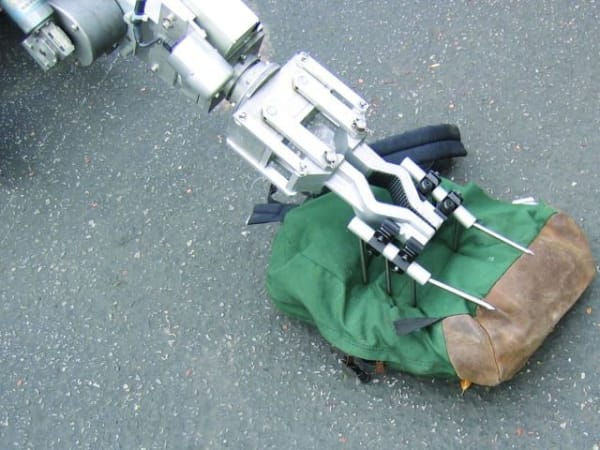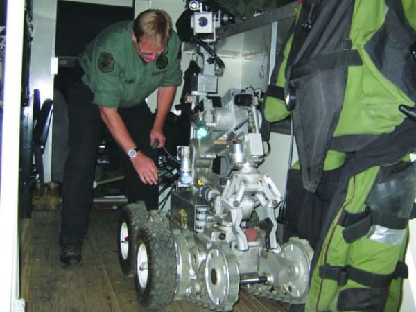 Robots can search potentially dangerous objects and report back on their progress via video to officers who can safely monitor the situation from afar. Technologies that make remote control of the robots possible include either fiber-optic or hard-tether cables, as well as wireless radio control.