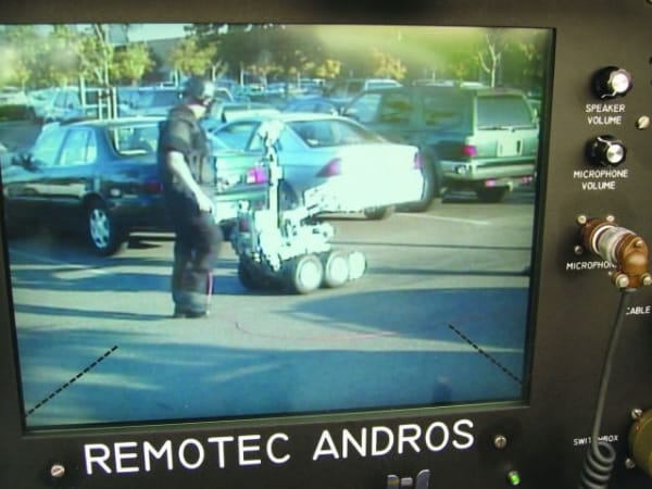 Officers can monitor a robot's deployment from a mobile command center or other remote location using a video system. Monitors are used to help coordinate with officers who are in closer proximity to the robot and allow commanders to make quicker decisions.