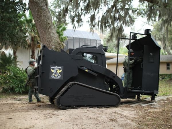 Ring Power's The Rook offers law enforcement agencies a versatile, tracked tactical vehicle with ballistic armoring rated to stop Level IV threats including armor-piercing rifle rounds. The Rook includes an armored deployment platform, hydrailic breaching ram, vehicle extraction tool, grapple claw, and 25-foot gooseneck trailer. The vehicle retails for $250,000. Photos courtesy of Ring Power.