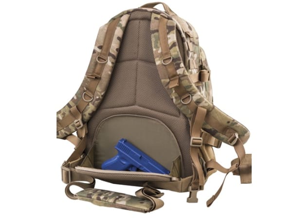 Elite 3 Day Backpack –Nylon construction for durability. 36 Liter capacity (2196 cubic inches)– 18.5"H x13"W x8"L, with multiple pockets/compartments for storing and organizing all your gear. Concealed padded zippered pocket built into kidney pad. Hydration compatible. Attached rain fly stows in bottom of pack.