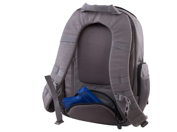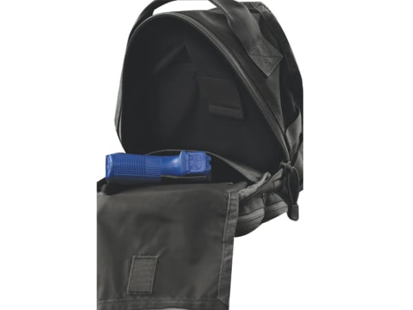 Stealth Backpack—1,050-denier Nylon construction for durability. 25-Liter capacity (1,525 cubic inches), 17.5"H x 8.5"W x 16"L, with large main compartment with padded bottom for storing and organizing all your gear. Concealed padded, zippered pocket built into kidney pad. Easy access hidden tabbed pistol pocket with loop inside for holster. Top fleece-lined zippered pouch.