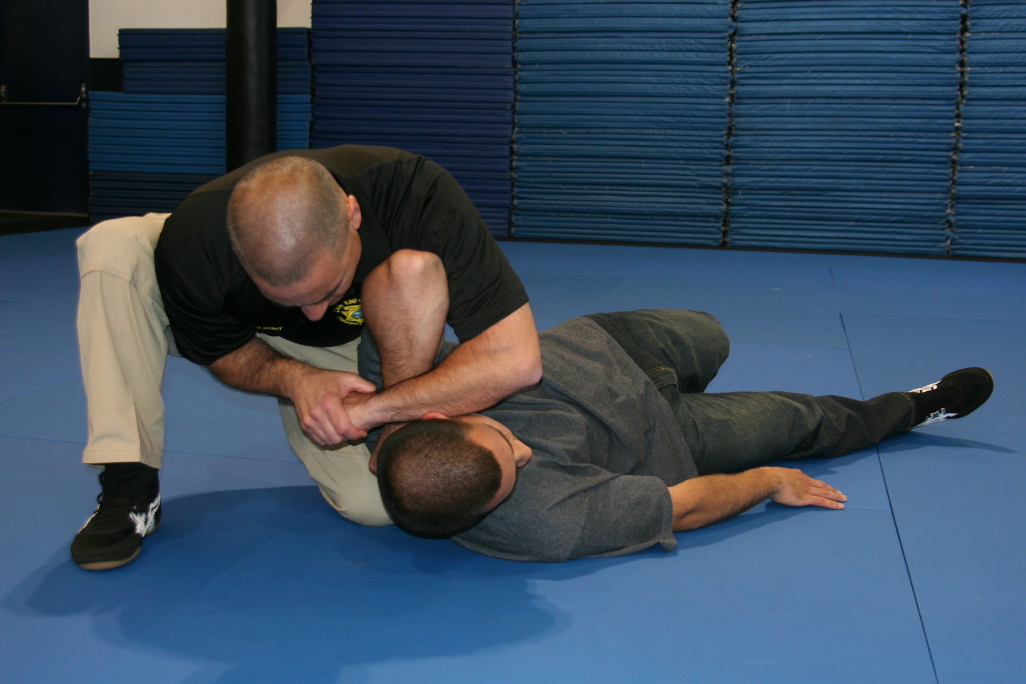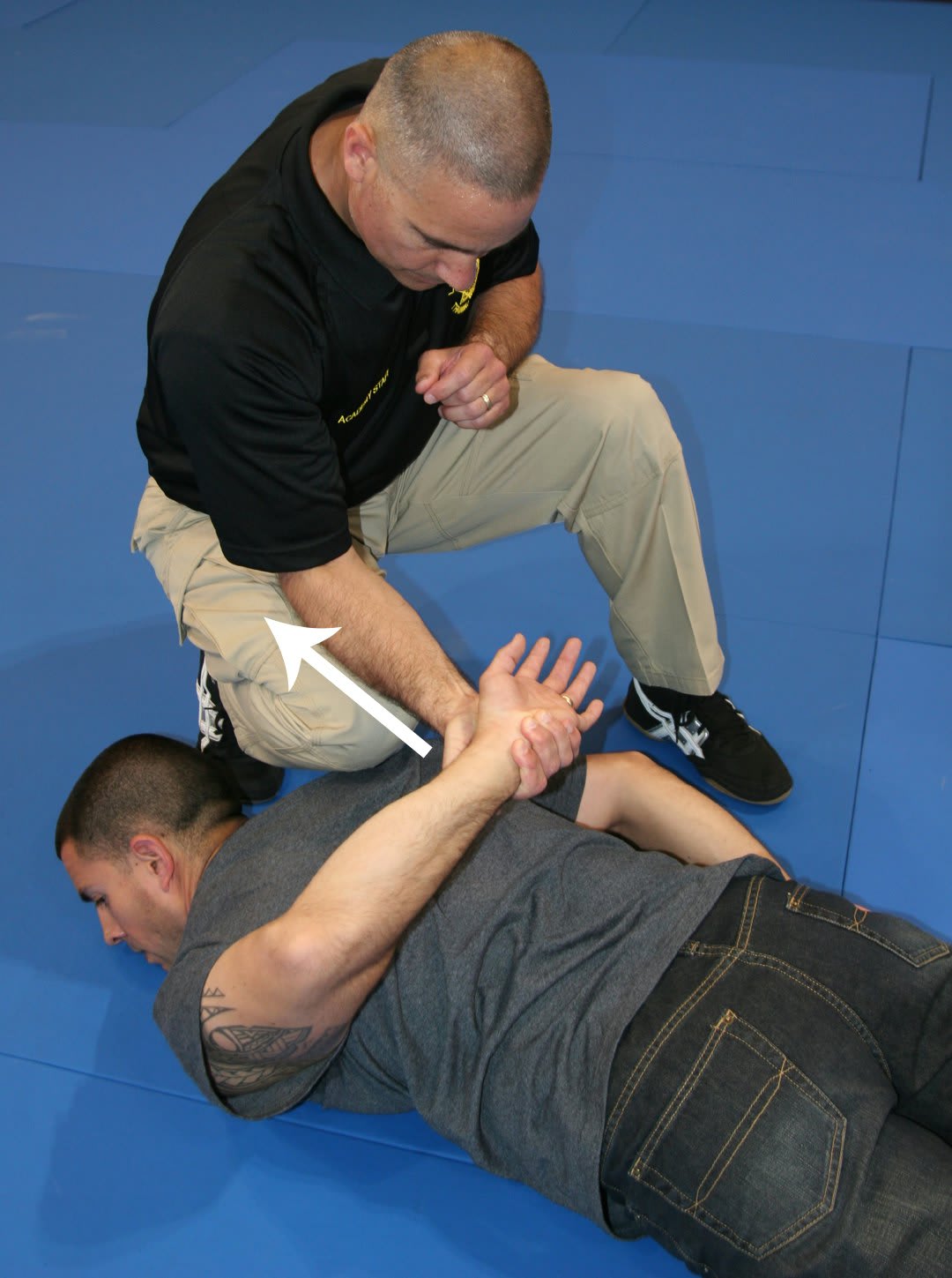 Transition to a Prone Control by placing your compressing hand on his elbow, while your locking hand controls the wrist.
