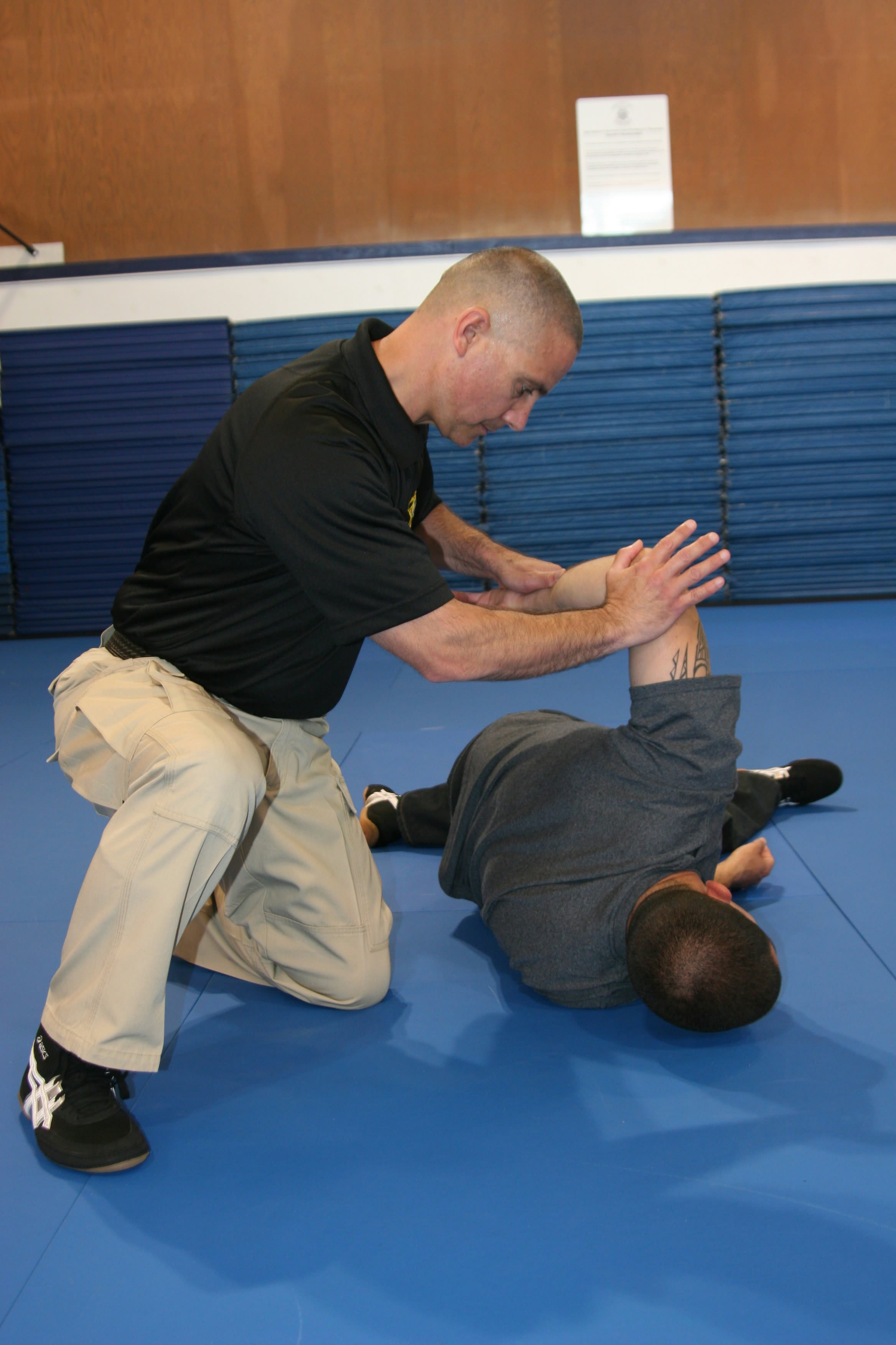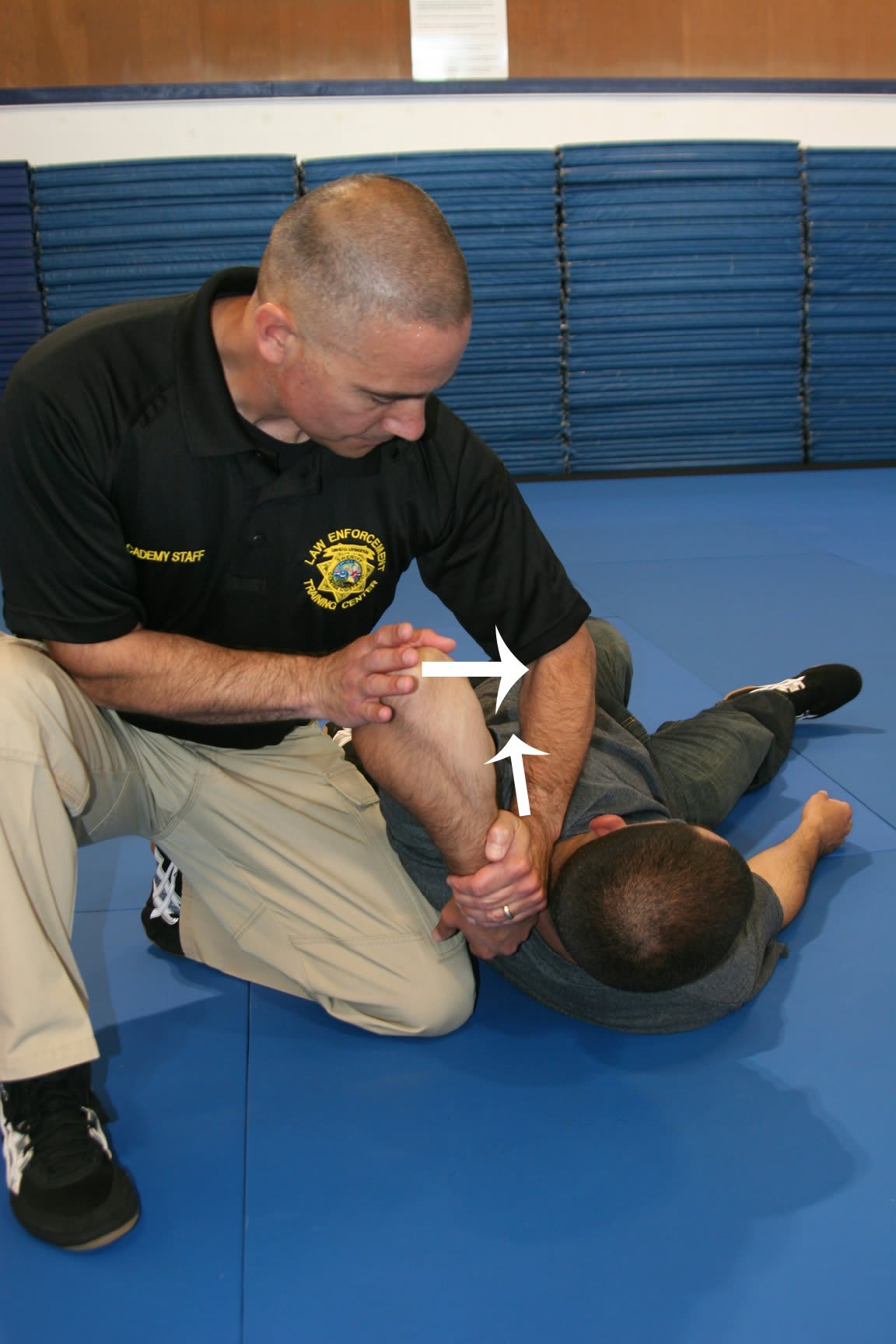 Once the suspect is prine, reach under with your driving hand and take control of the suspect's wrist. Pull the arm up and toward the suspect's head until his shoulder locks.