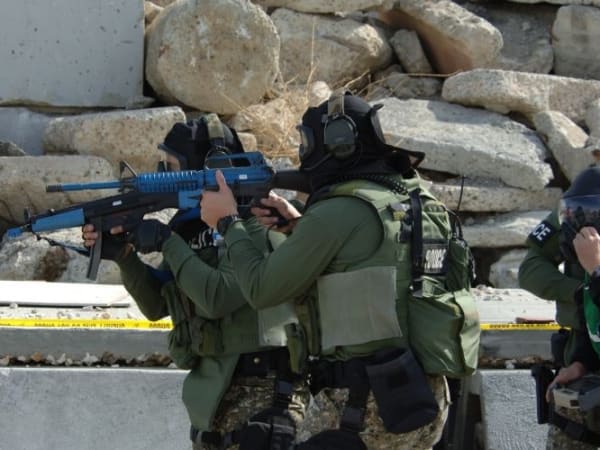A member of the Israeli Special Police Force uses cover from an armored rescue vehicle to approach a building as part of Exercises 6-8 — Multi-Agency Integrated Assault. Three agencies must coordinate an assault on a manufacturing plant. Venue: NUMMI Plant in Fremont.