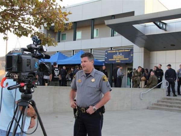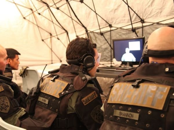 A sergeant with the Alameda County Sheriff's Office gives an interview to a television media outlet about Urban Shield, the nation's largest tactical training event.