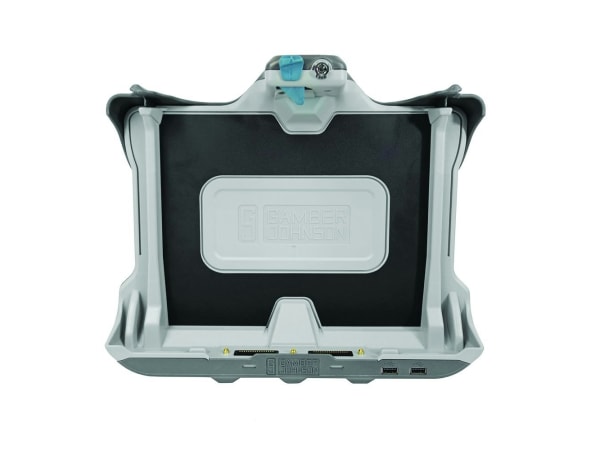Gamber-Johnson's K120 Tablet Docking Station for the Getac K120 fully rugged tablet offers an easy-to-use latching system allowing users to dock or release their K120 device effortlessly with only one hand. The docking station features a variety of ports (including front-facing fast-charging USB ports) to connect any mobile office peripheral device. In addition, Gamber-Johnson's K120 docking station can also accommodate Getac's hard handle, rotating hand strap, and high-capacity battery accessories so you never have to compromise. www.gamberjohnson.com