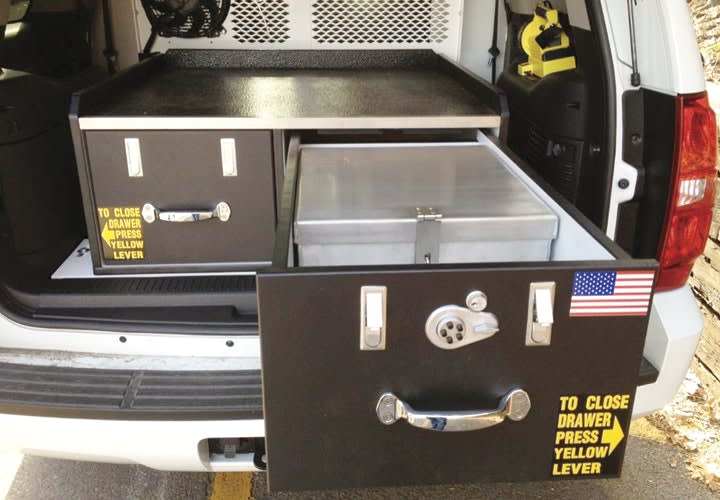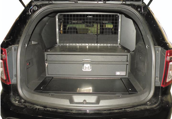 D&R Electronics’ lightweight aluminum Ford Utility Tactical Storage Cabinet Kit (model No. 933-0096A) fits the 2012/2013 model-year Ford Police Interceptor Utility and provides better organization of gear. The kit includes a subframe with an integrated electronics mounting panel, single drawer cabinet with dividers, and rear cargo partition, and it will still allow you to remove your spare tire.