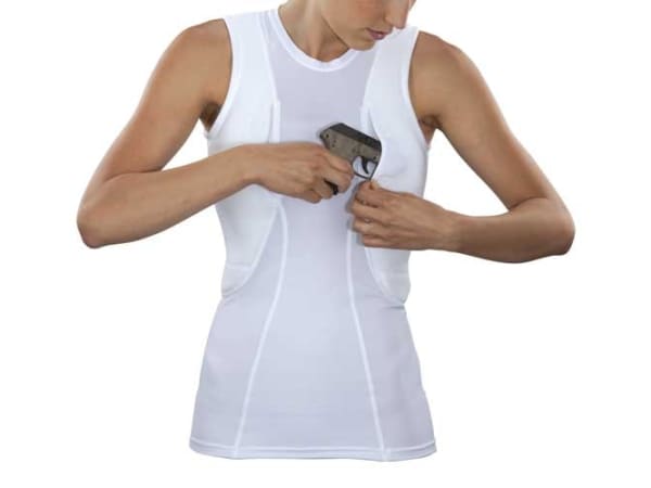 5.11 Tactical's sleeveless women's holster shirt is a female-specific concealed carry option. The shirt features a mesh shoulder yoke to distribute weight evenly. Highly durable fabric pockets under each arm provide plenty of space for a compact handgun, extra magazines or speedloaders, and firearm accessories. An outer mesh layer prevents printing and an inner neoprene layer adds a layer of comfort while carrying your firearm. The shirt also features moisture-wicking fabrics to keep you dry and comfortable. Available in black and white and in sizes S-XL.