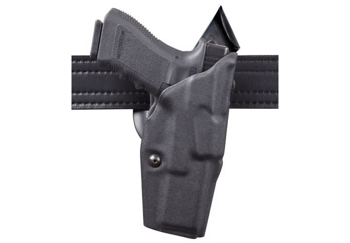 The Safariland Model 6390 ALS Level I Retention open-top duty holster can increase its security to Level II Retention with the optional Model 6006 ALS Guard and hood. This tough thermal-molded Safari Laminate holster is available for 2-inch or 2.25-inch belt slots, comes standard with the mid-ride Universal Belt Loop, and is offered in STX Tactical (all colors), STX Plain, STX Basketweave, and STX Hi Gloss finishes.