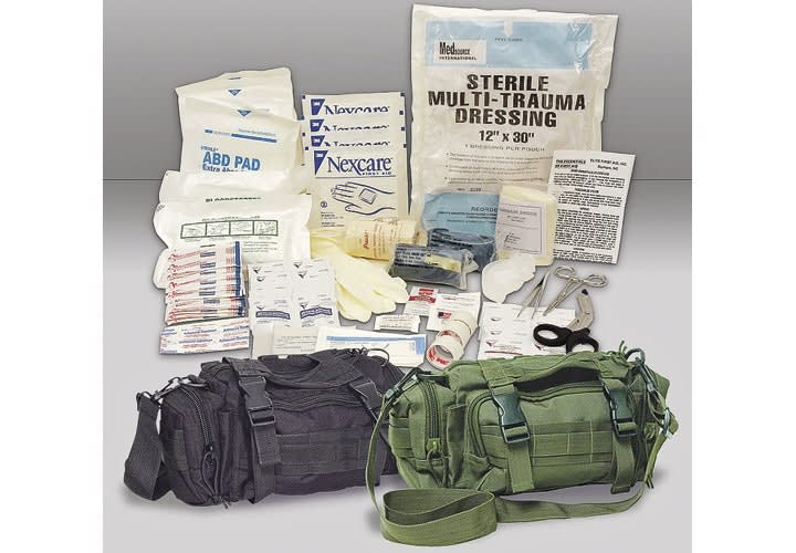 Voodoo Tactical's Rapid Response Bag is a medical kit that contains items to treat anything from minor wounds to severe trauma. Stored in the company's three-way deployment bag, it has five MOLLE straps on the back for vest wear but can also be worn on the shoulder. The Rapid Response Bag measures 11.5 x 5.5 x 6 inches and contains stainless steel tweezers, EMT shears, stainless steel hemostat, a sponge, a Blood Stopper kit, 16 bandage strips, an abdominal pad, a multi-trauma dressing, an airway tube, a suture, two pairs of non-Latex gloves, and 10 pain reliever pills.