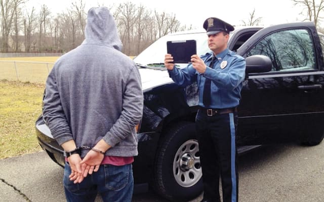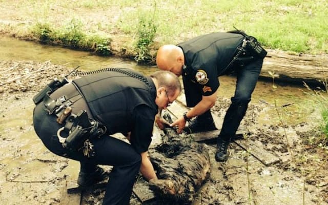 Photos: Willistown Township (Pa.) PD Facebook page. Photos posted on the Facebook page of the Willistown Township Police Department's Sergeant Mike Martin and Patrol Officer Mike Kushner rescuing a mud-trapped dog.