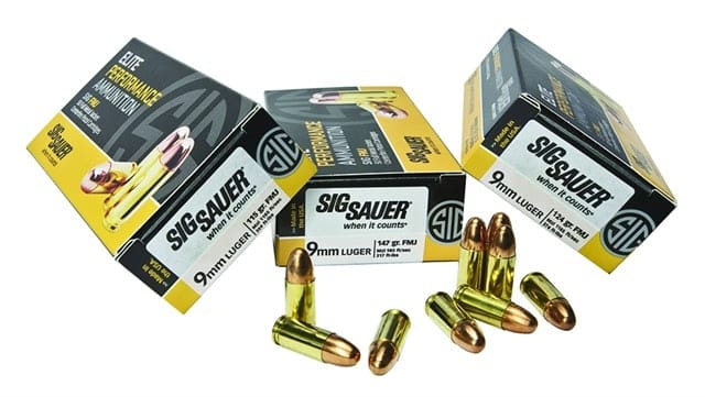 SIG Sauer has expanded its 9mm full metal jacket (FMJ) Elite Performance Ammunition offerings with the addition of 124-grain and 147-grain bullet weights. These new rounds are available in both the V-Crown jacketed hollow point (JHP) personal defense ammunition and the SIG FMJ target loads. The SIG FMJ ball ammunition is designed to approximate the performance of the corresponding JHP loads, making a seamless transition from target ammo to carry ammo. The copper-coated lead bullets in the SIG FMJ ammunition were engineered to have the most precise, uniform profile, resulting in consistent accuracy.