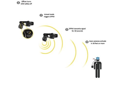 TASER International, maker of body-worn cameras, has announced its new Signal Performance Power Magazine. The SPPM is a smart battery that works with TASER's X2 and X26P Smart Weapons. It is designed to automatically inform Axon Fleet compatible cameras that a TASER Smart Weapon within signal range is armed, when the trigger is pulled, or when its arc switch is activated. The cameras can sense the Smart Weapon status change and start recording.
