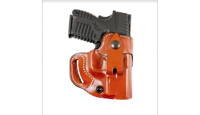 The DeSantis Gunhide Osprey is a trailing slot OWB/IWB holster built from premium tan saddle leather. The belt slots will fit belts up to 1 1/2" wide. The IWB strap is "cantable" and easily removed without tools. The #159 is available for medium and large autoloaders.