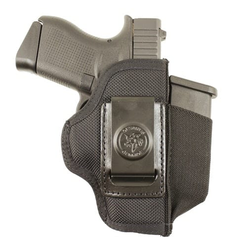 Twenty-two holster fits for the Glock 43 are now available. Included in these is the Pro Stealth, style N87, made from premium padded ballistic nylon. The 1.75-inch sturdy powder-coated black spring clip keeps this beauty securely anchored to your belt. The Pro Stealth is ambidextrous, and a spare magazine pouch is standard for auto-loader models.