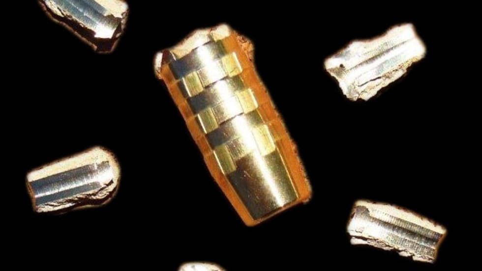 After 1 to 2 inches of penetration, the front nose portion breaks off into six pieces that radiate outwards in a star pattern while the base continues through for even deeper penetration.