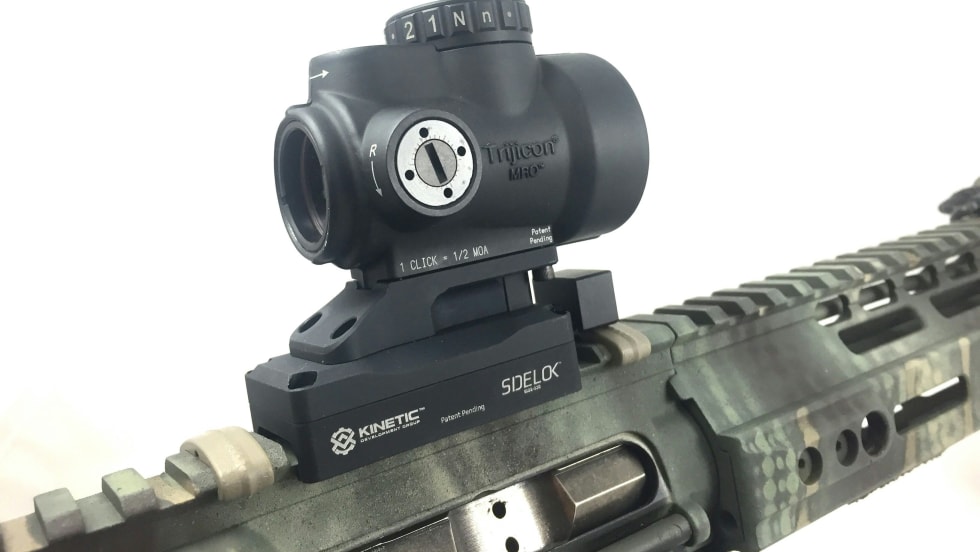 Kinetic Development Group's latest addition to its SideLok family of mounts is the new Trijicon MRO mount. The patented cam system locks the mount down onto a Picatinny rail without the need of tools, side levers, or huge knobs.