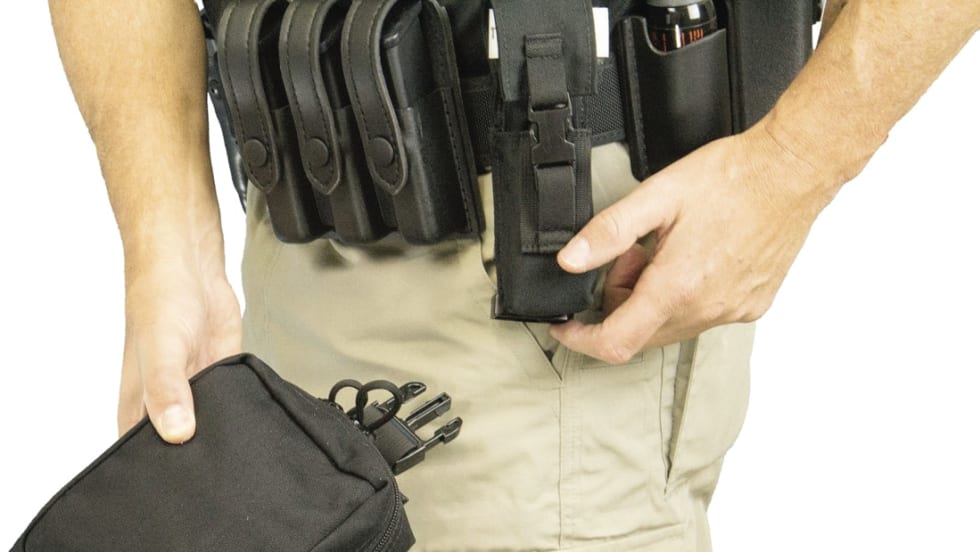 TSSi's Officer Individual First Aid Kit is intended to quickly mount onto an officer's gun belt and can be easily removed when not needed, leaving a tourniquet still affixed to the belt.