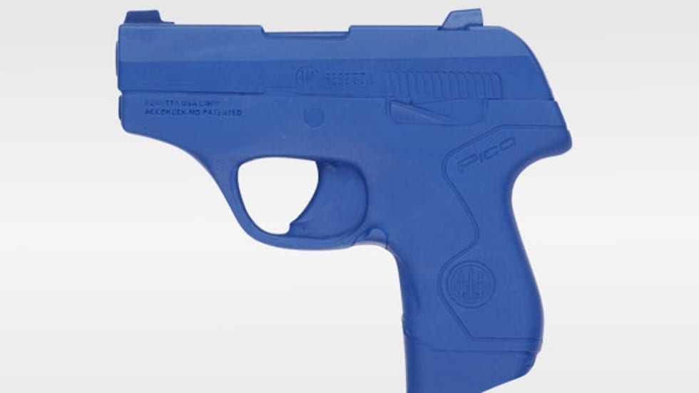 The Beretta Pico Bluegun training pistol replica from Ring's Manufacturing is molded from solid blue polyurethane to differentiate it from a live weapon.