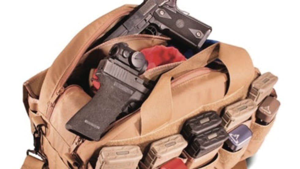 Tuff Products' Multi-Gun Range Bag is constructed of single- and double-layer Cordura and features two inner firearm padded compartments, two adjustable padded dividers, and dual exterior magazine pouches with removable flaps.