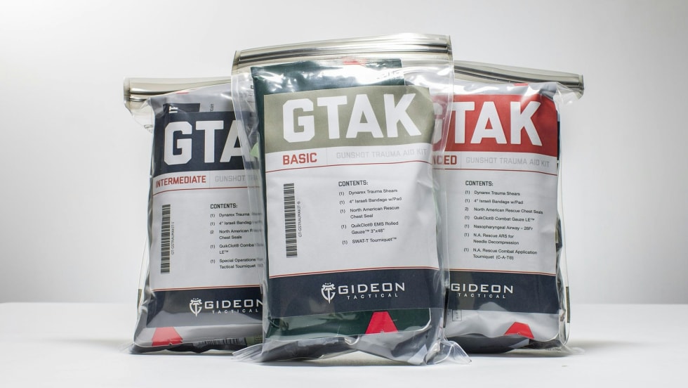 New, handcrafted Gunshot Trauma Aid Kits (GTAKs) from GideonTactical contain gunshot-trauma essentials for preventing exsanguination.