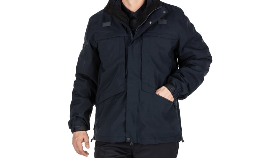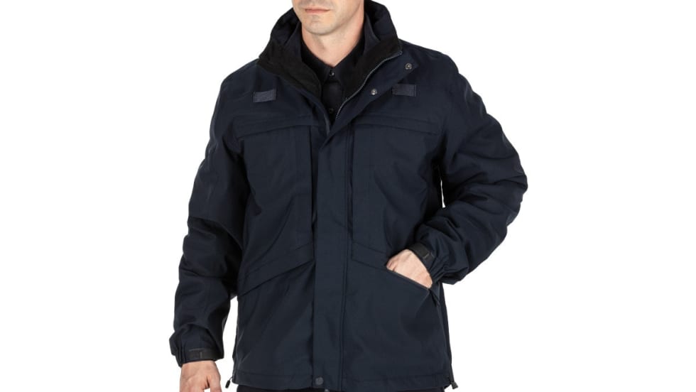 The six pocket outer shell on the 3-in-1 Parka 2.0 features a hood that can be rolled into the collar or detached.