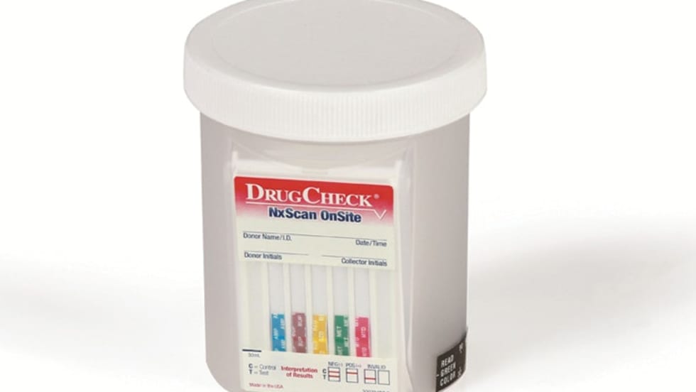 As with other DrugCheck test cups, the NxScan self-contained urinalysis screening device detects the presence of drug metabolites in minutes, using SAMHSA cutoff levels.