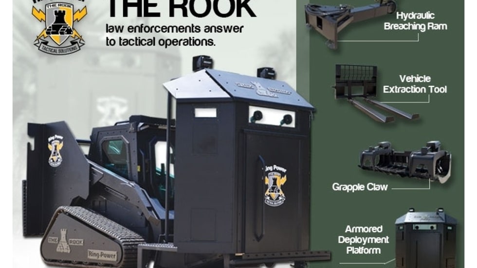 The Rook is custom designed with mission specific attachments, including; an armored deployment platform (holds 8 officers), hydraulic breaching ram, grapple claw, and vehicle extraction tool. IACP Booth #351