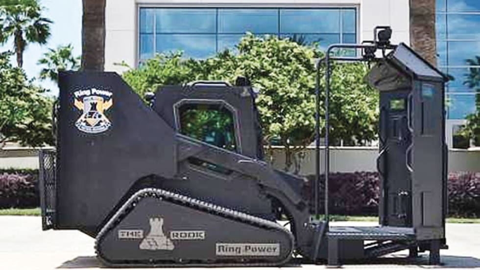 The Rook Vehicle is custom designed and fabricated by Ring Power Corporation with an Armored Deployment Platform, an integrated video system, and NIJ Level IV armor cab reinforcement fabrication.