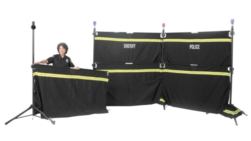 The SRN 1000 Premier Barrier System by Stop Rubbernecking contains three steel tripods and four heavy-duty fabric screens. The all-weather screens release and reattach in most winds and once assembled, the system is self-maintained.