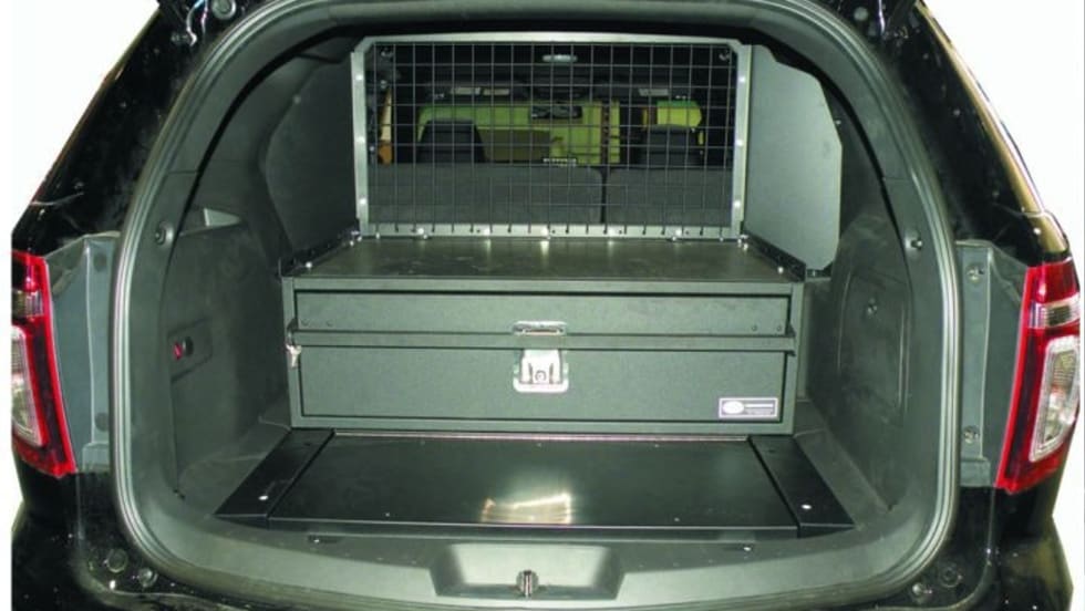 D&R Electronics' Explorer Cabinet Kit fits the 2013 model-year Ford Police Interceptor Utility and provides better organization of gear. The kit includes a cargo partition, single-drawer cabinet, electronics mounting panel, and lightweight powder-coated aluminum sub-frame.