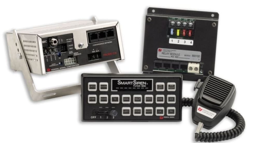 Federal Signal's PA300-CN utilizes the SmartSiren controller. This electronic siren offers the standard siren tones (wail, yelp, priority, air horn, and manual) with several additional features such as horn ring transfer, radio, and PA rebroadcast.