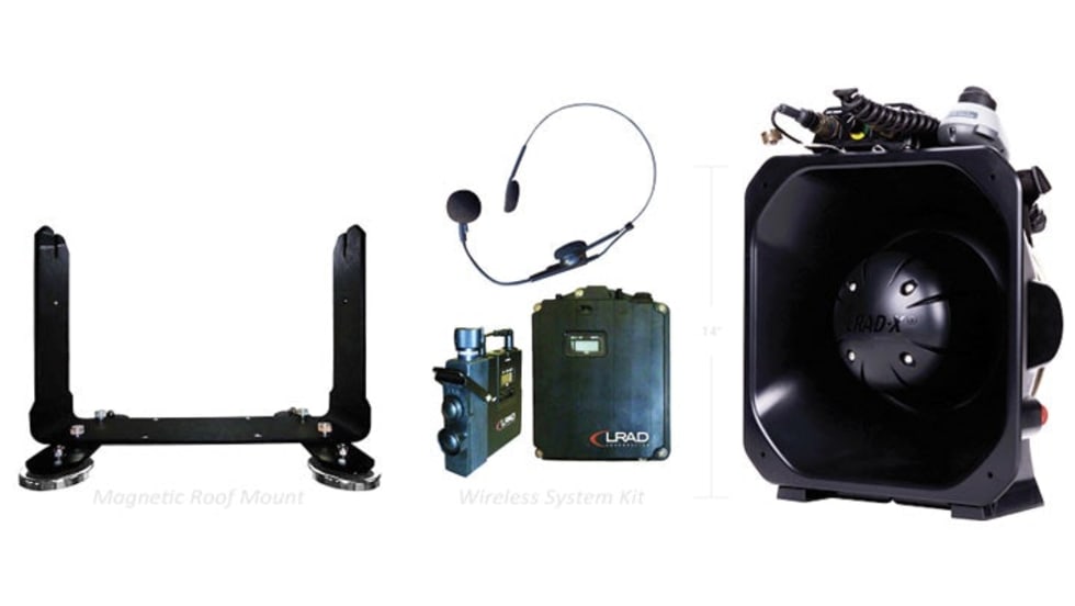 The LRAD 100X Force Protection Kit is a lightweight, portable, self-contained and self-powered communication system that broadcasts powerful, intelligible voice commands and warning tones over large distances.